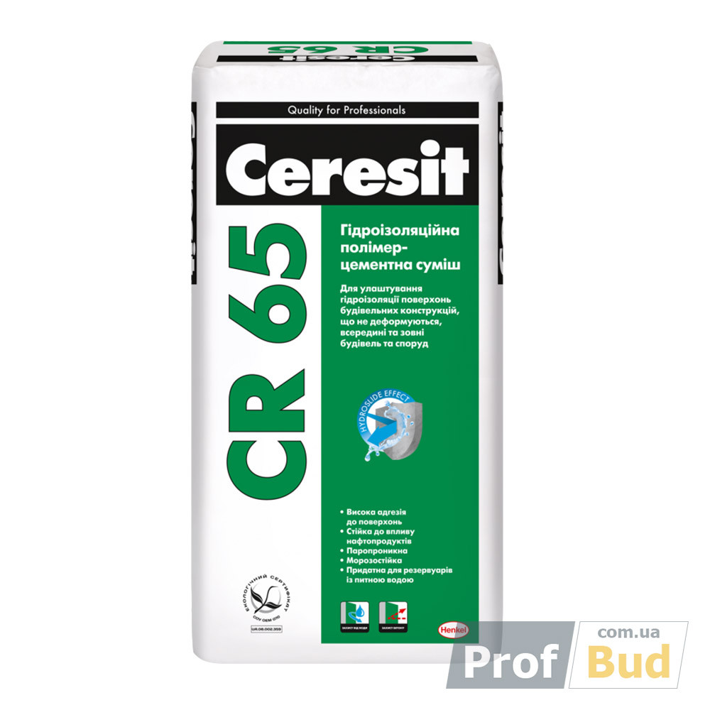 Суміш Ceresit CR 65 призначена для гідроізоляції будівельних конструкцій: басейнів, фундаментів, гідротехнічних споруд, резервуарів для зберігання води, у тому числі питної. Гідроізоляційна суміш застосовується з боку дії води. Захист від періодичного зволоження: 2 шари обмазувальної гідроізоляції. Захист від постійного зволоження: 2 шари обмазувальної гідроізоляції. Захист від гідростатичного напору до 5 метрів водяного стовпа: 2 шари обмазувальної гідроізоляції та шар штукатурної.