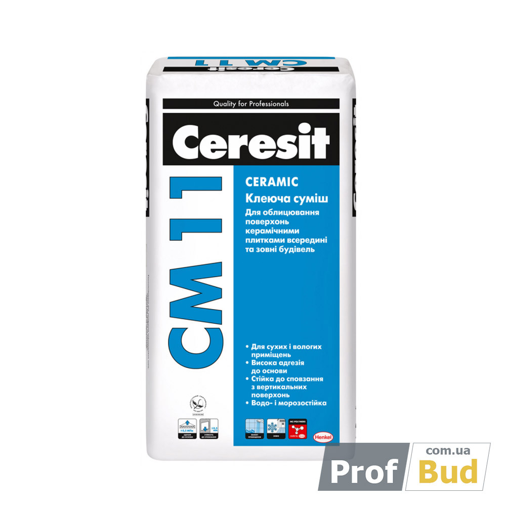 Суха суміш Ceresit СМ 11 призначена для облицювання бетонних, цегляних, цементно-піщаних, цементно-вапняних, гіпсових та інших мінеральних горизонтальних та вертикальних поверхонь, які не деформуються, керамічними плитками розмірами не більше ніж 40×40 см з водопоглинанням не менше 1%. Суміш Ceresit СМ 11 застосовується всередині та зовні будівель у житлово-цивільному та промисловому будівництві. Для облицювання зовнішніх поверхонь, а також приклеювання керамогранітних плиток з водопоглинанням менше 1% необхідно використовувати суміш Ceresit CM 11 з додаванням емульсії Ceresit CC 83.