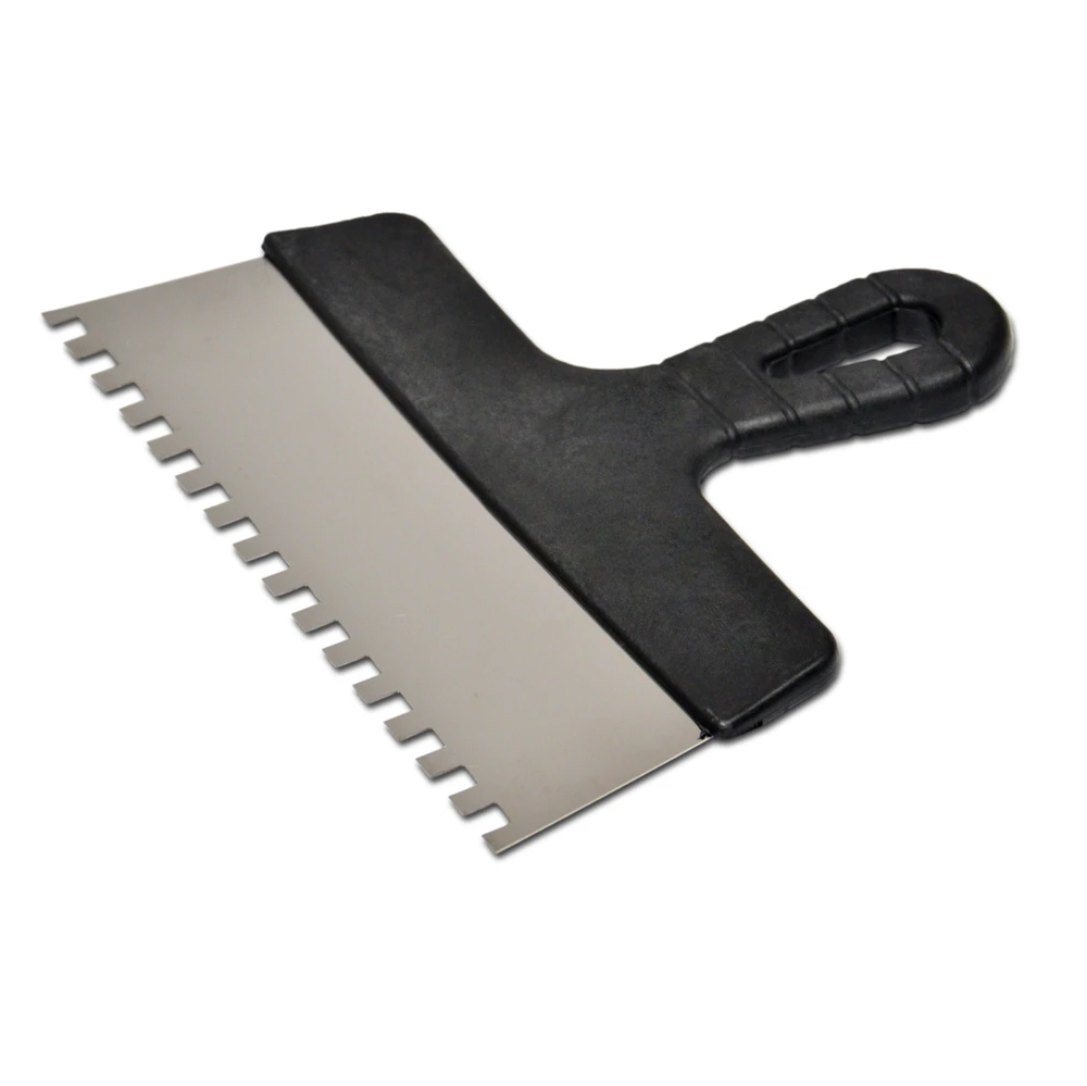 Шпатель із пластмасовою ручкою – лезо виготовлене з нержавіючої сталі, ручка з отвором для підвішування. Зуб квадратної форми. Застосовується для нанесення клейових та цементних сумішей на керамічну плитку, натуральний камінь під час проведення облицювальних робіт.